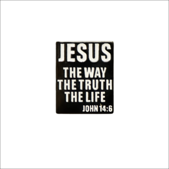 Een metalen zwartkleurige pin met de tekst uit Spreuken 31:25: She laughs without fear of the future.